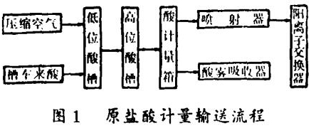 該系統(tǒng)工藝復(fù)雜,操作困難,安全性低,在一次向高位酸槽壓送濃鹽酸的過程中,曾發(fā)生過鹽酸噴出傷人的事故。因此對整個系統(tǒng)進行了改進(見圖2)
