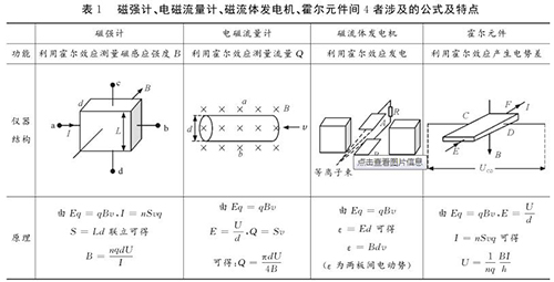 易錯點2:磁強計、分體式電磁流量計、磁流體發(fā)電機、霍爾元件間的區(qū)別與聯系磁強計、分體式電磁流量計、磁流體發(fā)電機、霍爾元件都是利用電磁場對帶電粒子的偏轉效應,并且穩(wěn)定時電場力與磁場力均達到平衡。很多學生容易將其混淆,遇到問題常常搞不清原理,亂代公式,筆者特將4者涉及的公式及特點等做一對比區(qū)別如表1所示。