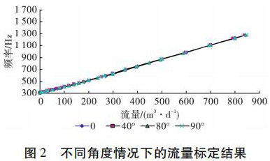 為了考察井眼斜度變化對(duì)進(jìn)水流量計(jì)測(cè)量流量的影響,開展了非集流進(jìn)水流量計(jì)在不同斜度情況下的流量測(cè)量模擬實(shí)驗(yàn)。模擬實(shí)驗(yàn)在大慶油田多相流實(shí)驗(yàn)室進(jìn)行,儀器外徑 38 mm,模擬井筒內(nèi)徑為 124 mm,實(shí)驗(yàn)介質(zhì)是水,傾斜角度分別為 0°、40°、80°和 90°( 水平) ,流量范圍為 5 ~ 850 m3 /d。實(shí)驗(yàn)結(jié)果表明,在儀器居中條件下,井眼斜度變化對(duì)進(jìn)水流量計(jì)的儀表常數(shù)沒有影響,滿量程誤差不大于 4% ,因此可以應(yīng)用進(jìn)水流量計(jì)進(jìn)行水平井注水剖面測(cè)量。不同角度情況下的實(shí)驗(yàn)結(jié)果如圖 2 所示。