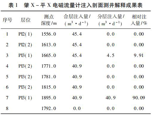 2017 年 9 月在大慶油田采油八廠肇 X - 平 X 水平井注水井中*次進(jìn)行了水平井注入剖面測(cè)井現(xiàn)場(chǎng)試驗(yàn)。該井斜深2 055. 42 m,水平段長度為568. 46 m,試驗(yàn)?zāi)康氖峭ㄟ^注入剖面測(cè)井了解該井各層段的注水情況,同時(shí)對(duì)水平井測(cè)井工藝、儀器的適用性、井下牽引器及井口輔助裝置等設(shè)備的工作有效性和可靠性進(jìn)行評(píng)價(jià)。現(xiàn)場(chǎng)試驗(yàn)中,在密閉條件下錄取到了該井的注入剖面測(cè)井資料,進(jìn)行了重復(fù)測(cè)量,重復(fù)測(cè)量結(jié)果在誤差允許范圍內(nèi),測(cè)井成果見表 1。該井施工壓力 6. 0 MPa,注入量45. 4 m3 /d,有 7 個(gè)射孔層,分 8 個(gè)測(cè)點(diǎn)測(cè)量,2 個(gè)層有吸入顯示,其中,P13( 1) ( 1 734 ~ 1 767 m) 層絕對(duì)吸入量4. 5 m3 /d,相對(duì)吸入量為9. 91 %,P13( 1) ( 1 899 ~1 943 m)層絕對(duì)吸入量 40. 9 m3 /d,相對(duì)吸入量為 90. 09% ,測(cè)井成果見表 1。通過與甲方的交流,再結(jié)合該井的動(dòng)靜態(tài)資料及周圍井的工作狀況,采油廠的地質(zhì)人員認(rèn)為本次測(cè)井結(jié)果能比較準(zhǔn)確地反映該井的注入情況。