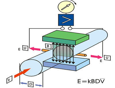 與此相仿.在磁感應(yīng)強(qiáng)度為B的均勻磁場(chǎng)中,垂直于磁場(chǎng)方向放一個(gè)內(nèi)徑為D的不導(dǎo)磁管道,由上式可見(jiàn),體積流量qv與感應(yīng)電動(dòng)勢(shì)e和測(cè)量管內(nèi)徑D成線(xiàn)性關(guān)系,與磁場(chǎng)的磁感應(yīng)強(qiáng)度B成反比,與其它物理參數(shù)無(wú)關(guān).這就是電磁流量計(jì)的測(cè)量原理.